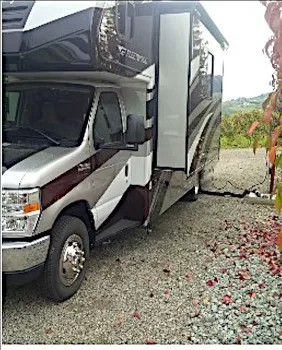 RV just arrives at mobile home park in Kelowna, BC Canada around 2015 Big Mama hawk at RV park